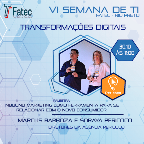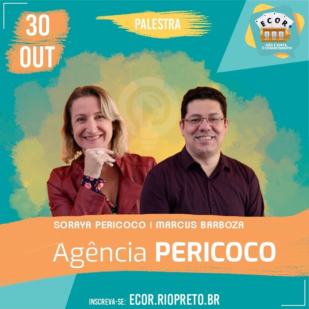 Gostou do papo? Esse é o conteúdo das palestras que os diretores da agência Pericoco, Soraya Pericoco e Marcus Barboza, darão no dia 30 de outubro em dois eventos que acontecem em Rio Preto: às 11h, na VI Semana de TI Fatec Rio Preto, e às 19h30, no Ecor Rio Preto da Unirp.